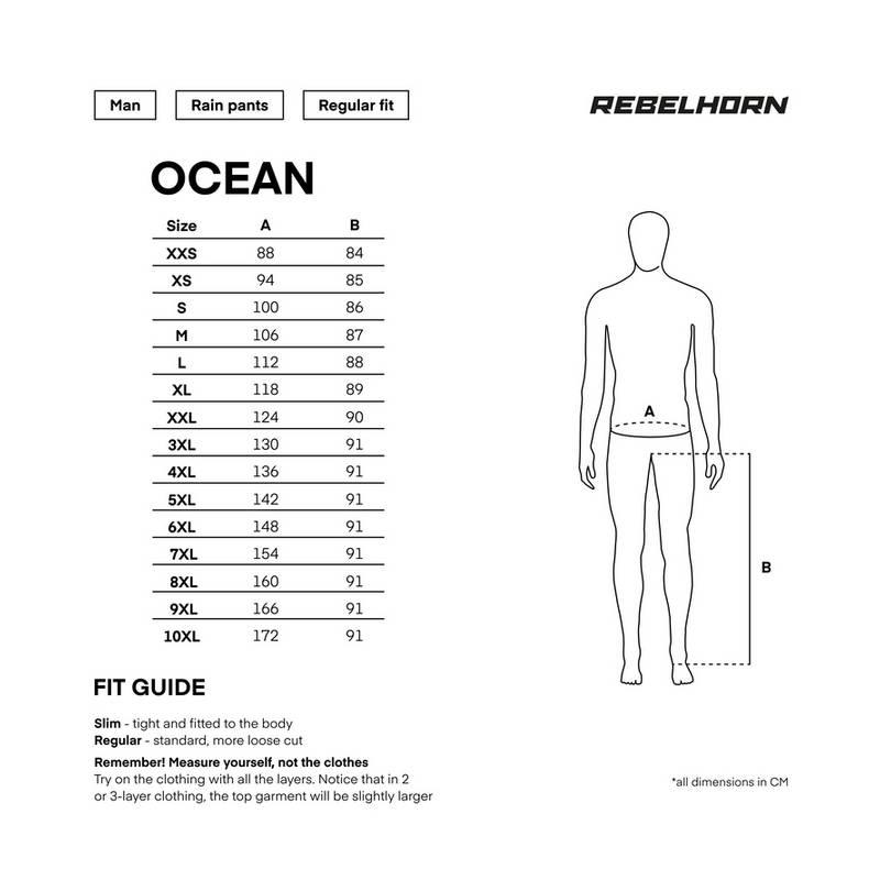 Rebelhorn Ocean dežne hlače so izdelane iz elastičnega materiala za optimalno prileganje in udobje. Popolnoma nepremočljive in odporne na veter. Material omogoča dihanje in se obnese odlično v vseh vremenskih pogojih. Vodni stolpec do 8000mm/m2, odporno na veter in omogoča dihanje do 2000g/m2 s pomočjo laminirane membrane.